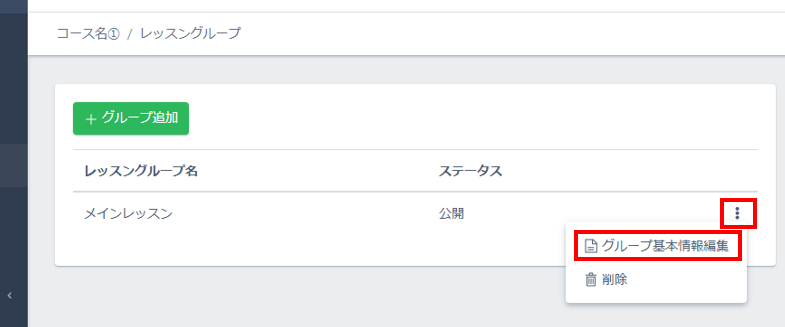 デフォルトで「メインレッスン」というレッスングループがあるので、その名前を変更します。右端の縦3点リーダをクリックし、「グループ基本情報編集」をクリックします。
