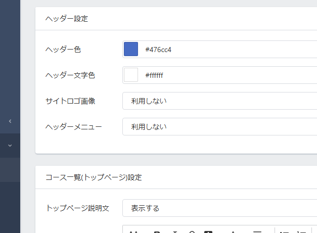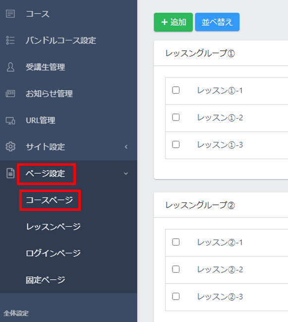 左のメニューの「ページ設定」→「コースページ」をクリックします。(「ページ設定」はサイト or コース or レッスンいずれかの設定ページにアクセスすれば左メニューに表示されます)