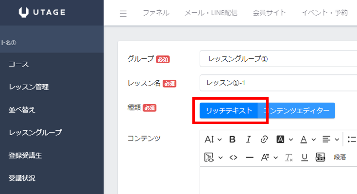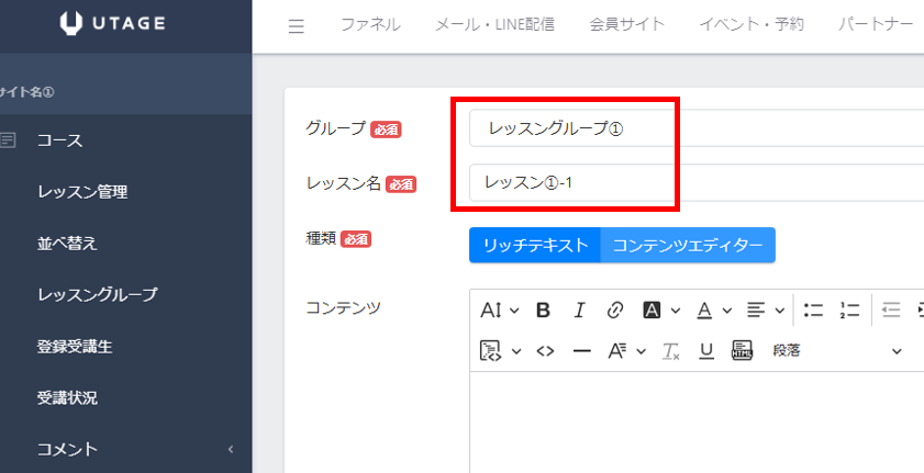 次に、各レッスングループにレッスン(=コンテンツ)を入れていきます。