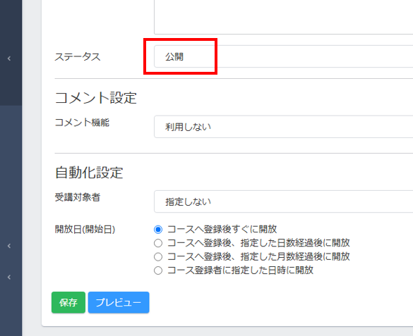 ※通常は、上のような設定は不要で、「コースへ登録後すぐに開放」にチェックを入れておいてください。