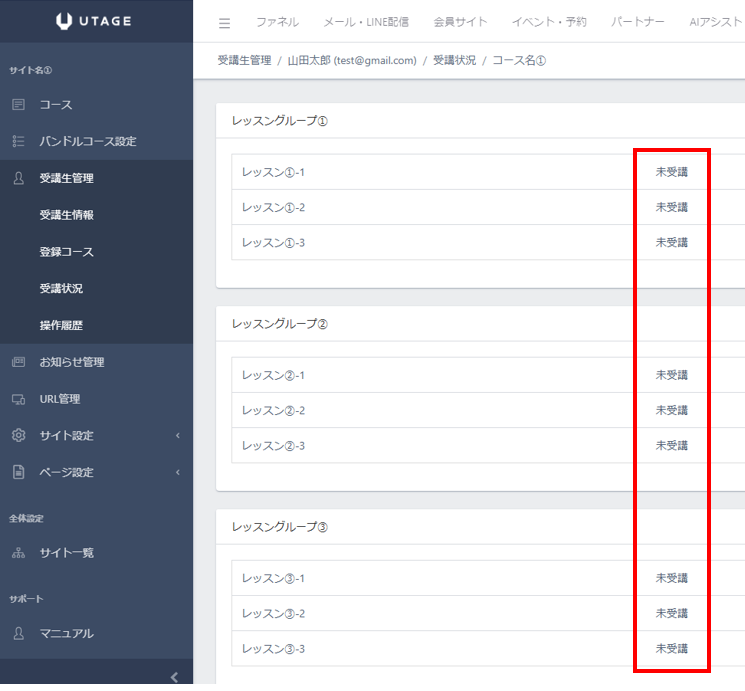 以上で、受講生が会員サイトにアクセスすることができるようになりました。(「自動化設定」の「受講対象者」で、期間を指定した場合はその期間に限定されます)