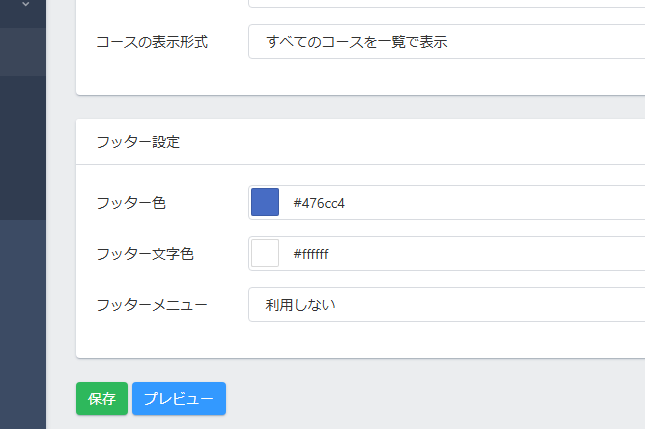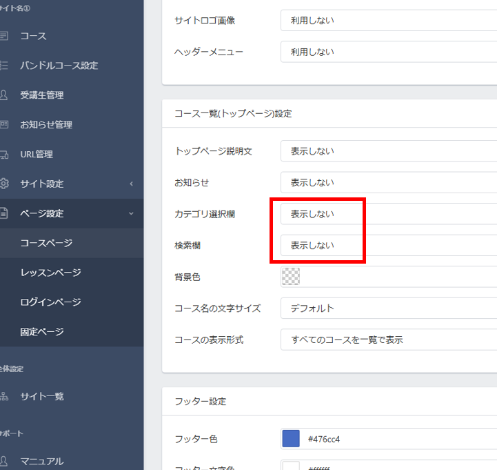 先程のヘッダーとフッターの設定の間にある「コース一覧(トップページ)設定」の「カテゴリ選択欄」と「検索欄」を「表示しない」に変更します。