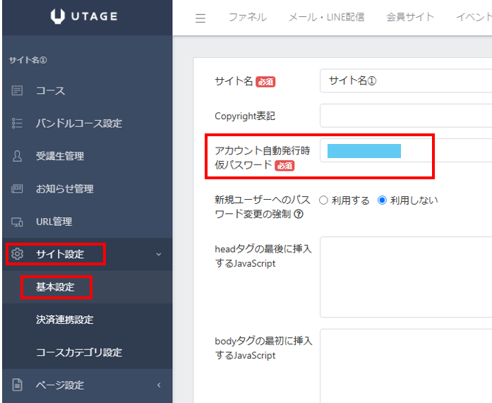 左メニューの「サイト設定」→「基本設定」をクリックし、「アカウント自動発行時仮パスワード」から設定できます。