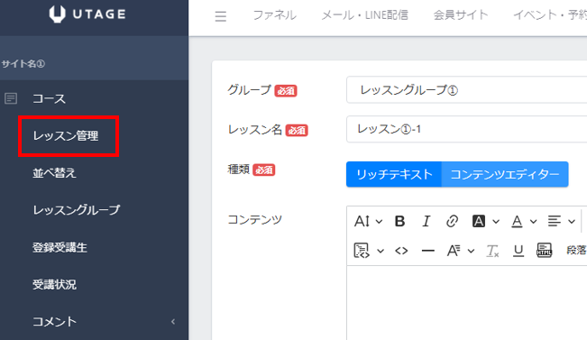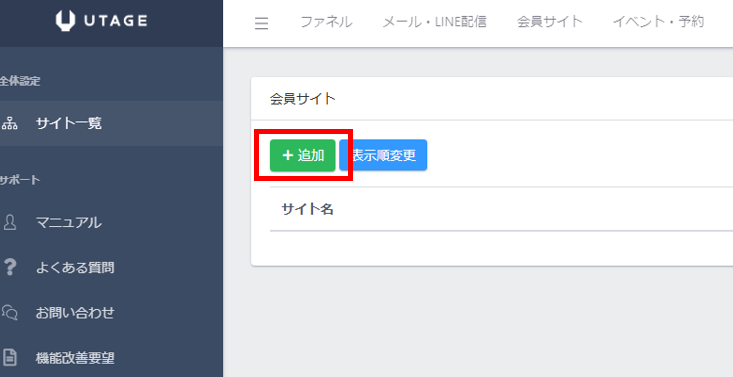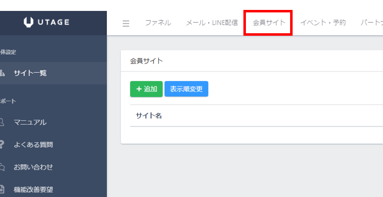 UTAGEの上のメニューにある「会員サイト」をクリックします。