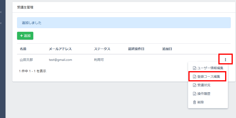 会員サイトにアクセスできるようにするためには、右側の縦3点リーダをクリックし、「登録コース編集」をクリックします。