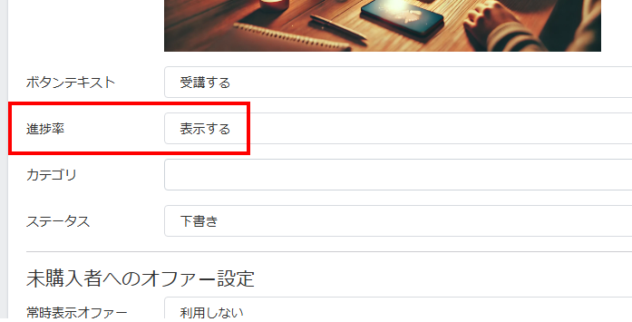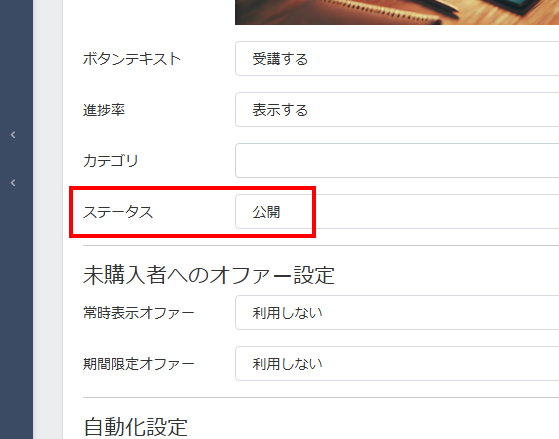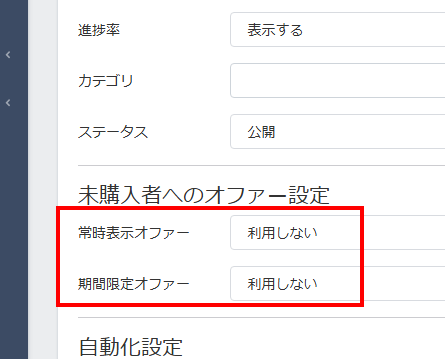 「未購入者へのオファー設定」では、コースを購入していない方に表示させて購入できる状態にするかどうか設定できます。基本的にはデフォルトの「利用しない」にしておきます。