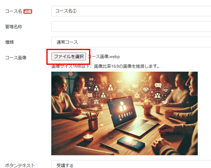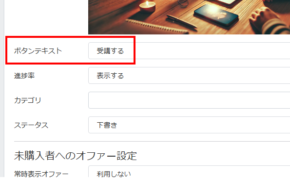 「ボタンテキスト」は「カスタム」を選択すると自由に設定できますが、「受講する」のままで問題ありません。