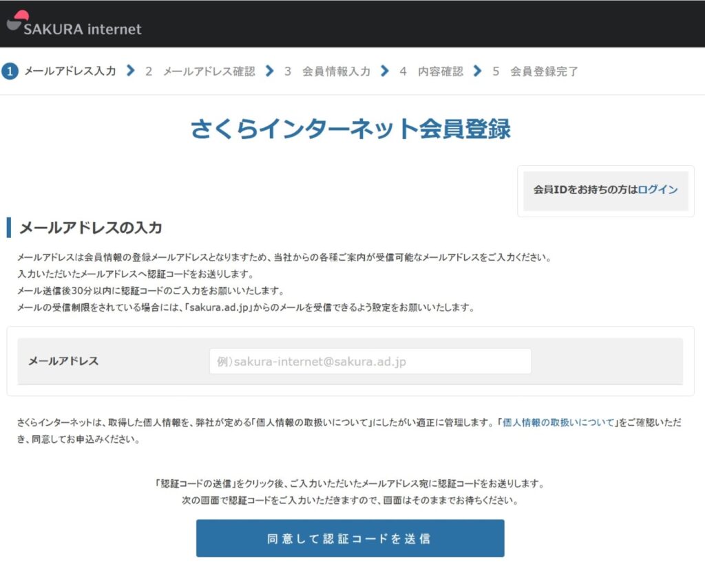 画面中央の「メールアドレス」欄に受信できるメールアドレスを入力して、「同意して認証コードを送信」の青いボタンをクリックしてください。