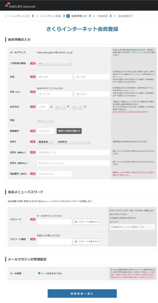 最後に最下部の「確認画面へ進む」の青いボタンをクリックしてください。